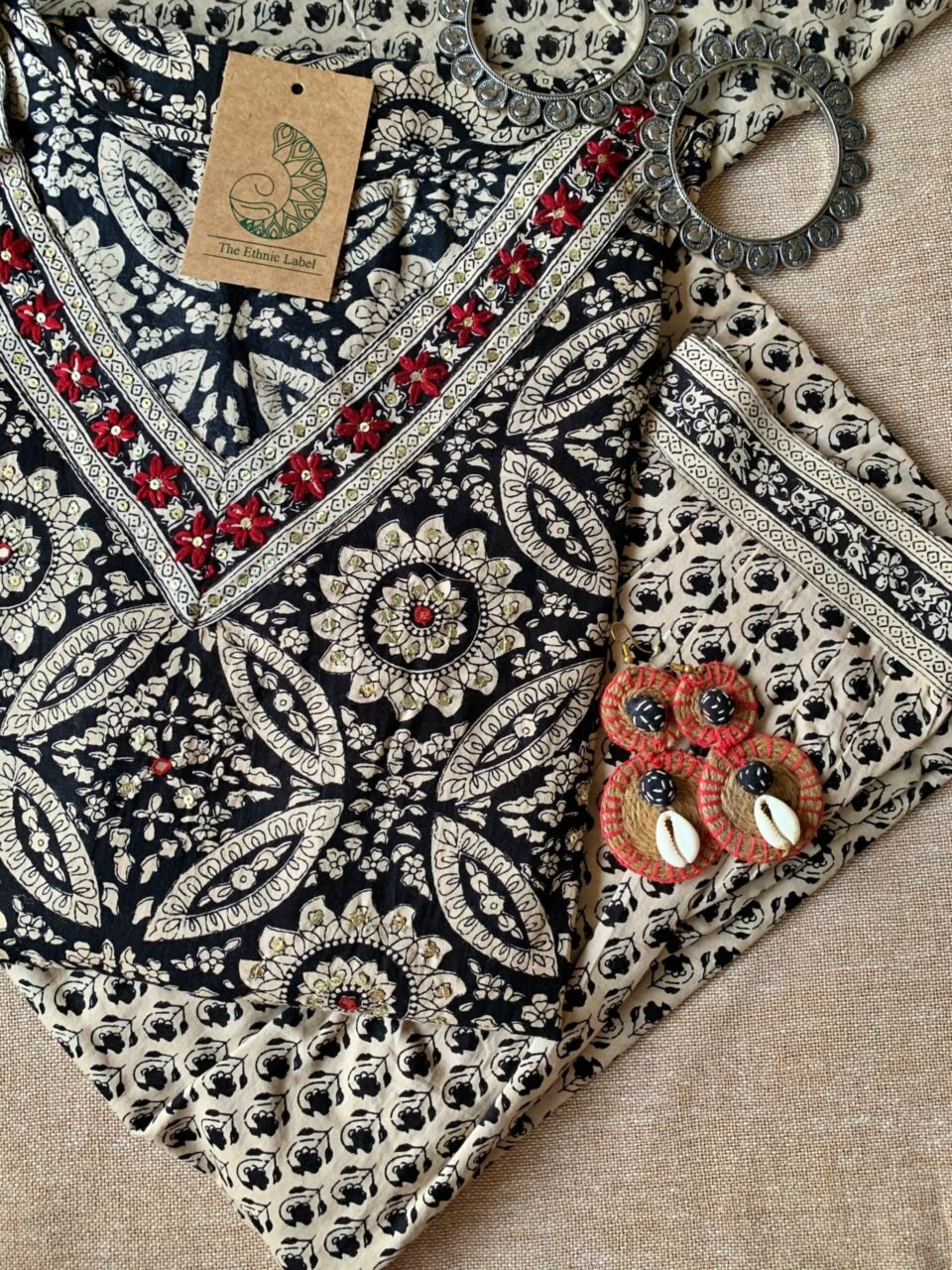 Hand Embroidered Black Ajrakh Afghan Pant Kurta Set with Dupatta - 3 pc