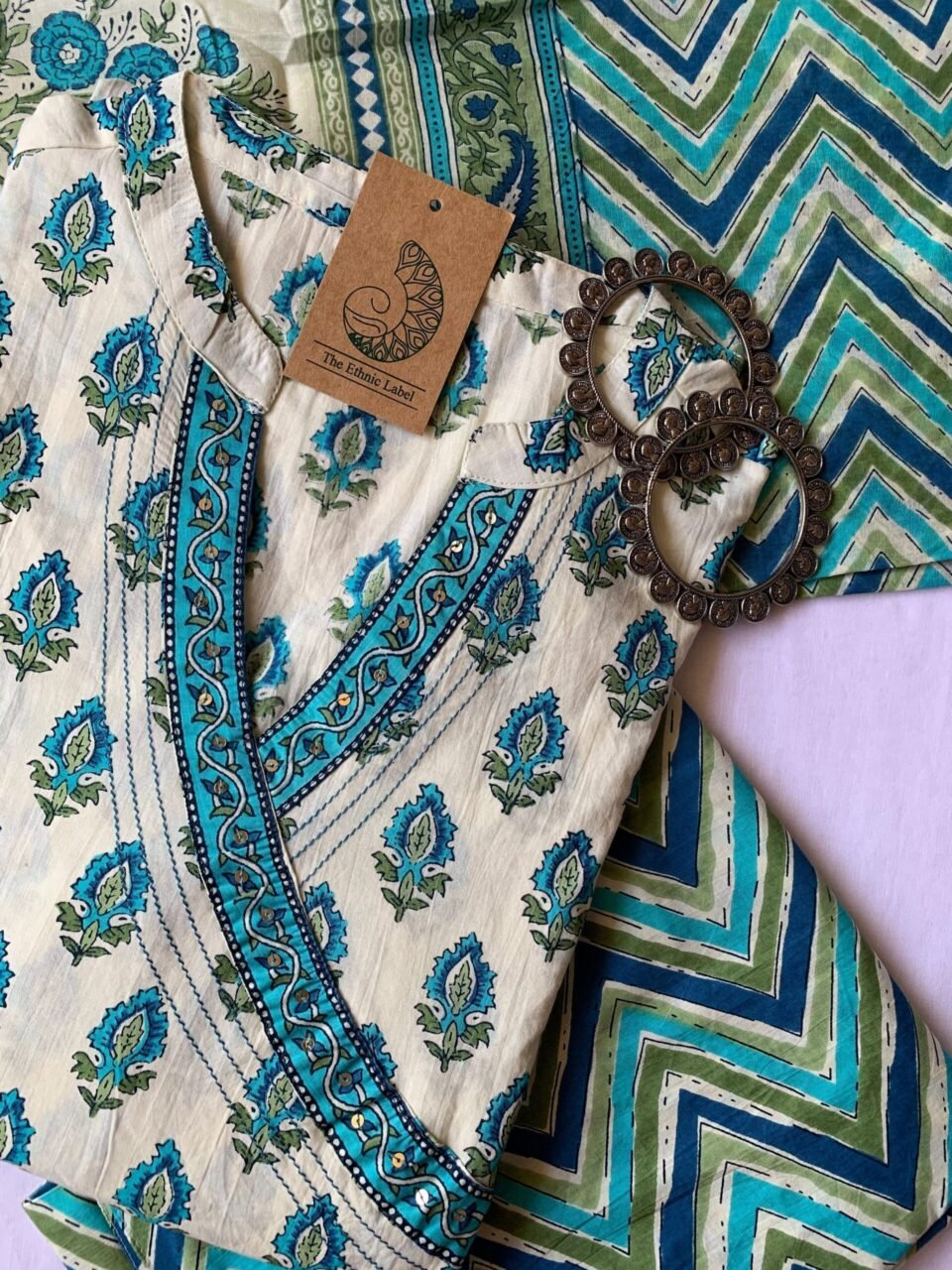 Firozi Boota Angrakha Cotton Kurta Set with dupatta - 3 pc
