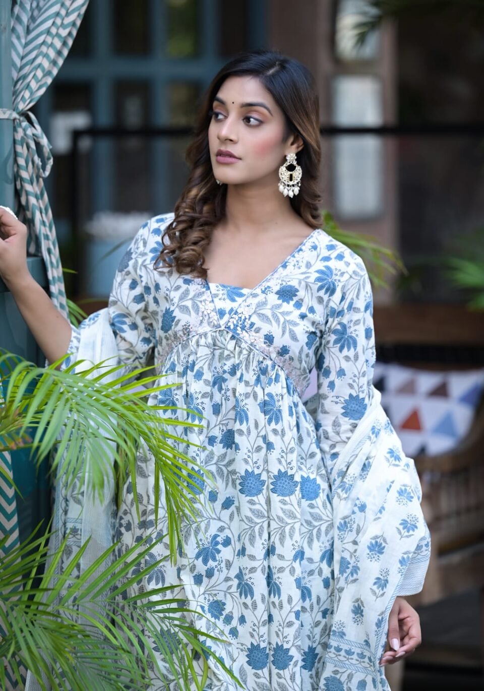 Soothing Floral Premium Cotton Suit Set – Sea Blue