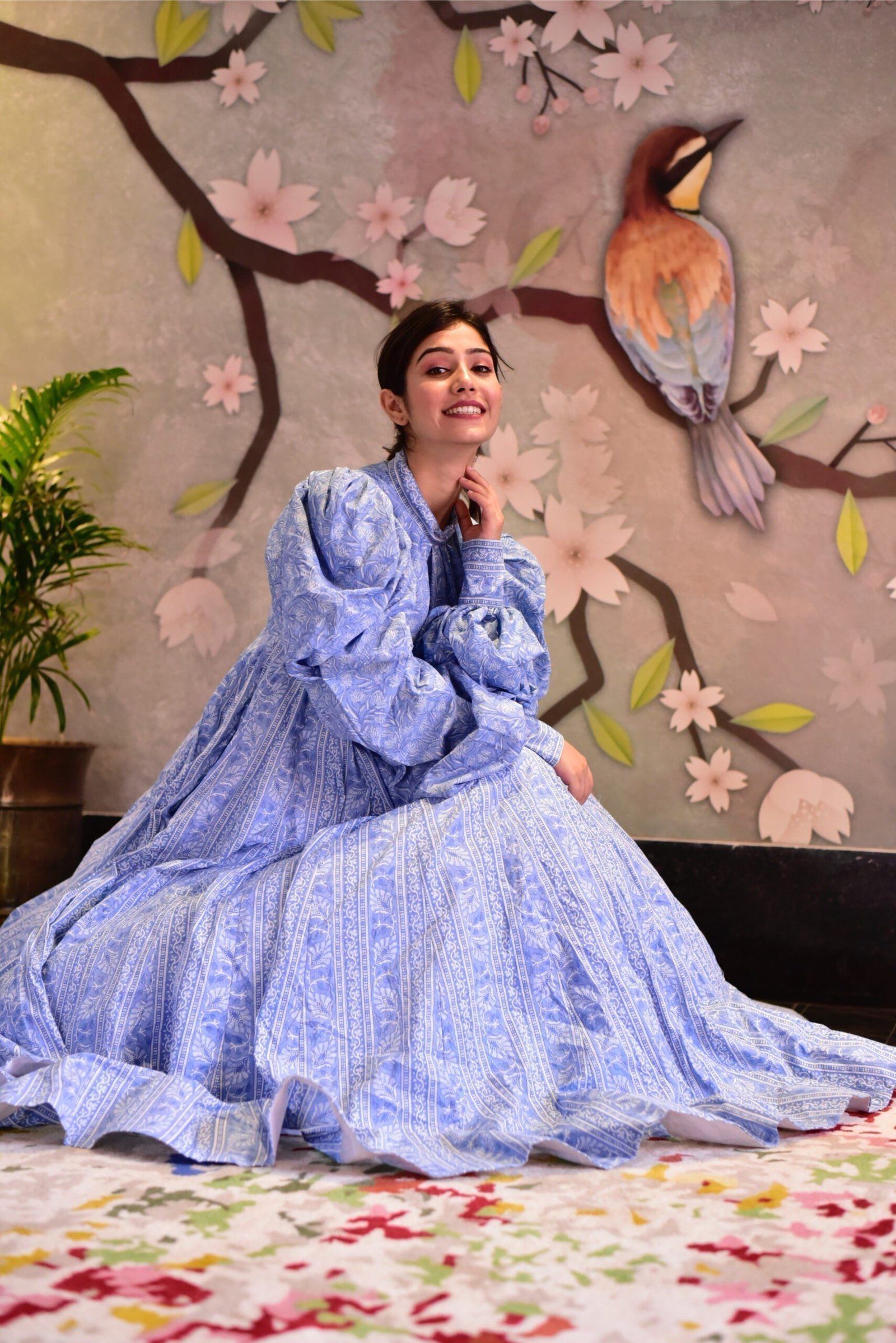 increase the grace of this bright and breezy blue, printed floor length flared dress made in finest quality of cotton fabric , the chic sleeves add richness to its pre- existing beauty.!