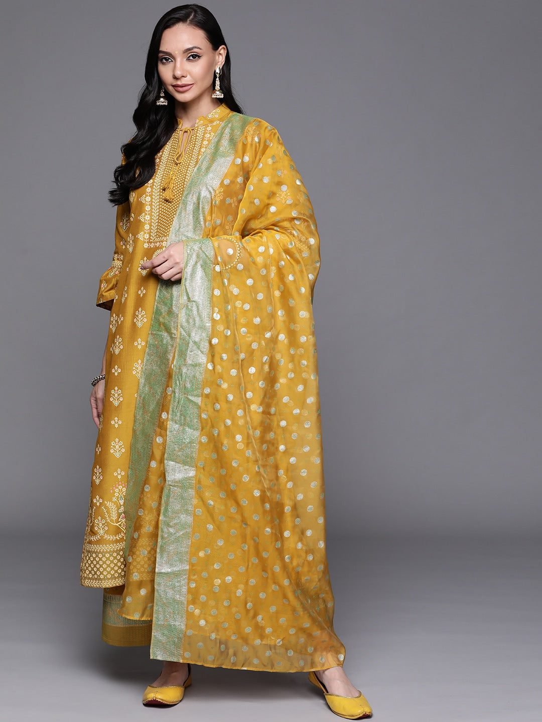 Light, bright, and full of life, this suit set will make a delightful addition to your wardrobe. Tailored with flowy silhouettes with classic golden prints, it is spruced up with a trendy fit.