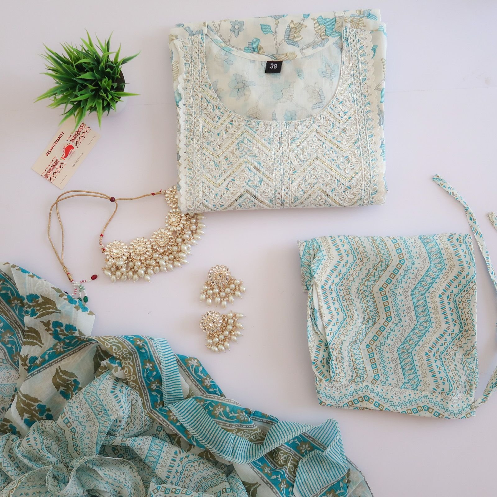 This three piece set includes kurta, pants and dupatta.
