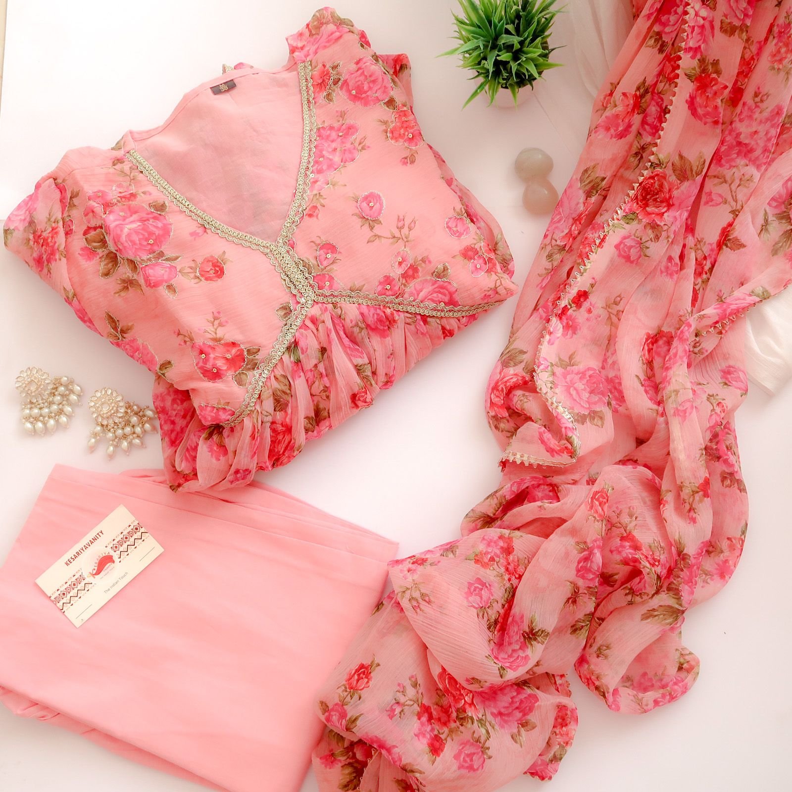 This three piece set includes kurta, pants and dupatta.