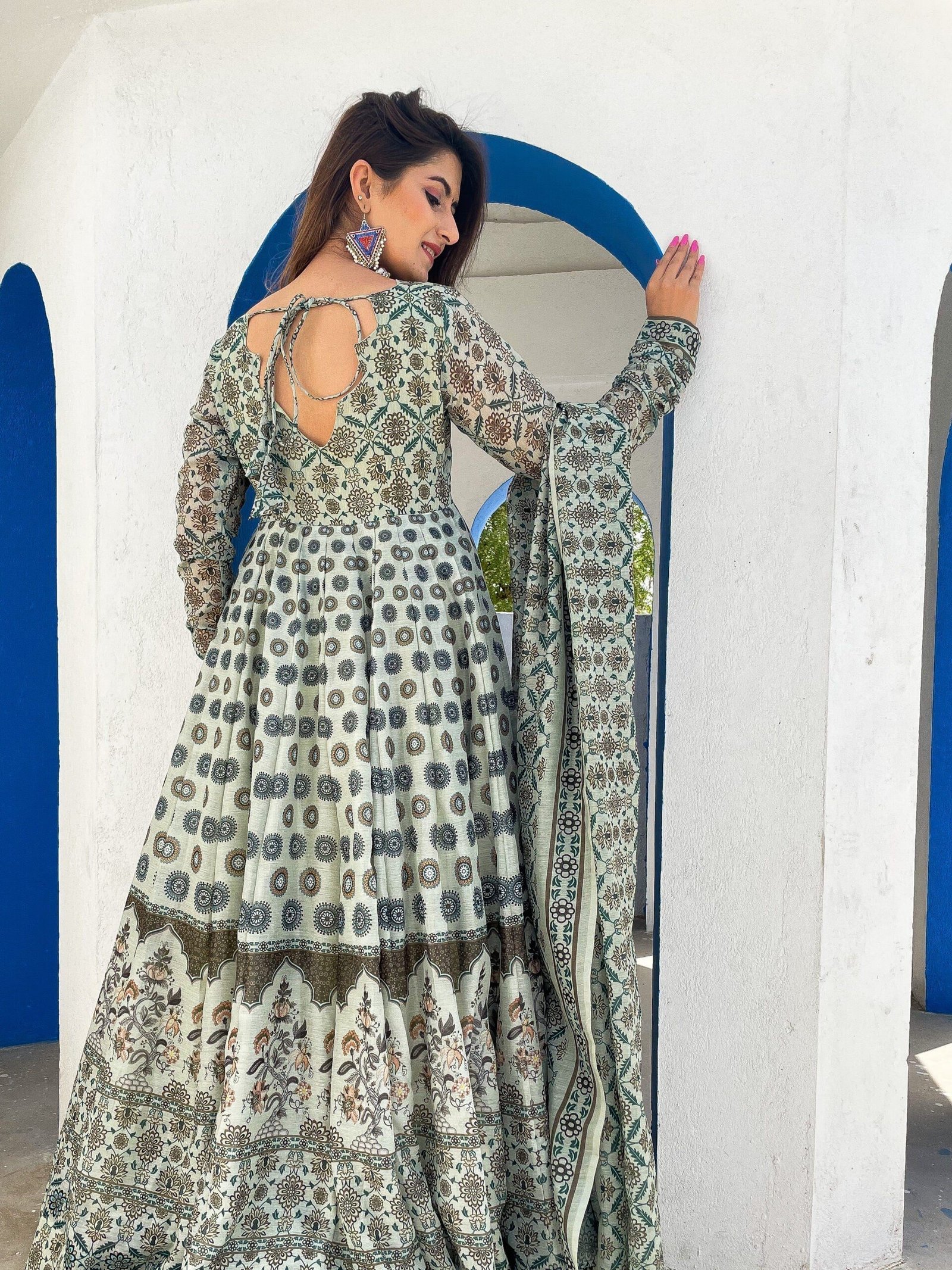 swirl around with joy in our elegant attire and feel the elegance within! be your bold self in this rich printed floor length gown paired with a matching dupatta.!