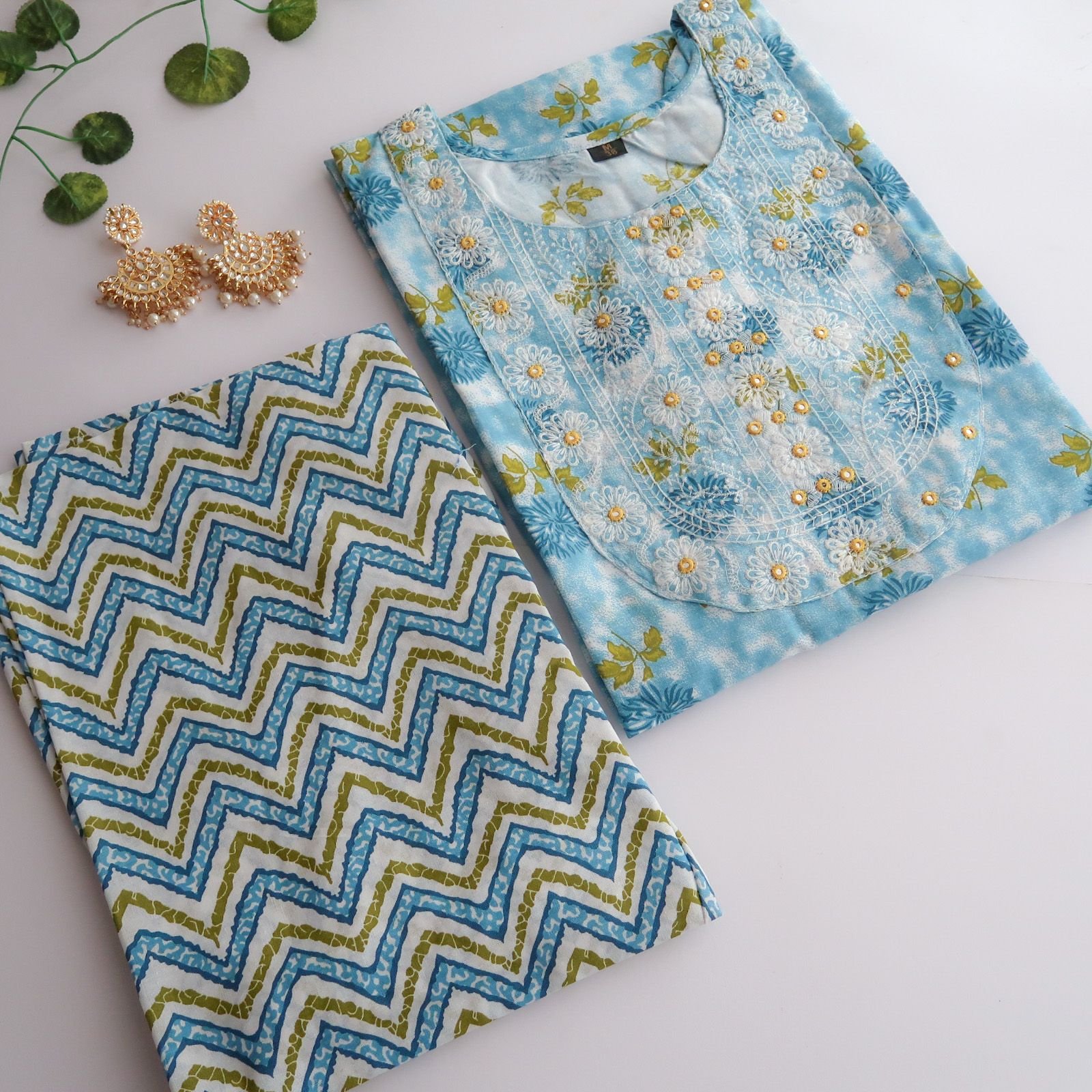 cotton kurta with cotton pants, Half drawstring and half elastic closure.